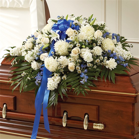 Honor a life so beautifully lived with a proud display of blue and white blooms. Our half casket cover, crafted with care and artistry by our expert florists with blue delphinium, white roses, and accented with a blue satin ribbon, is an unforgettable way to commemorate a lifetime of loving devotion.