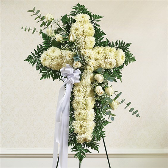 Honor a lifetime of faithful devotion with our beautiful standing cross arrangement. Our expert florists handcraft each of these impressive displays with a bed of white mums in the shape of a cross, and accent with a cascade of crisp white roses. It is a beautiful way to offer peace and comfort during a difficult time. •Standing cross arrangement of white football mums and roses; accented with baby’s breath and soft, lush greenery •Appropriate for the funeral home •Our florists use only the freshest flowers available, so colors and varieties may va